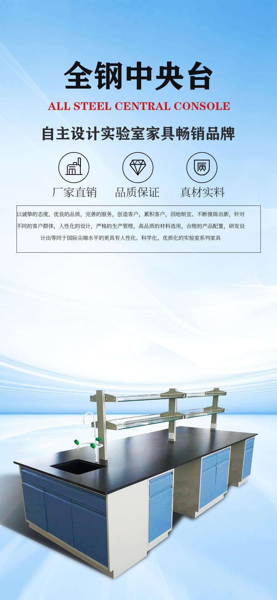 公司以誠摯的態度,優良的品質,完善的服務,創造客戶,累積客戶,因地制宜、不斷推陳出新,針對不同的客戶群體,人性化的設計,嚴格的生產管理,高品質的材料選用,合理的產品配置,研發設計出等同于國際尖端水平的更具有人性化、科學化、優質化的實驗室系列家具。